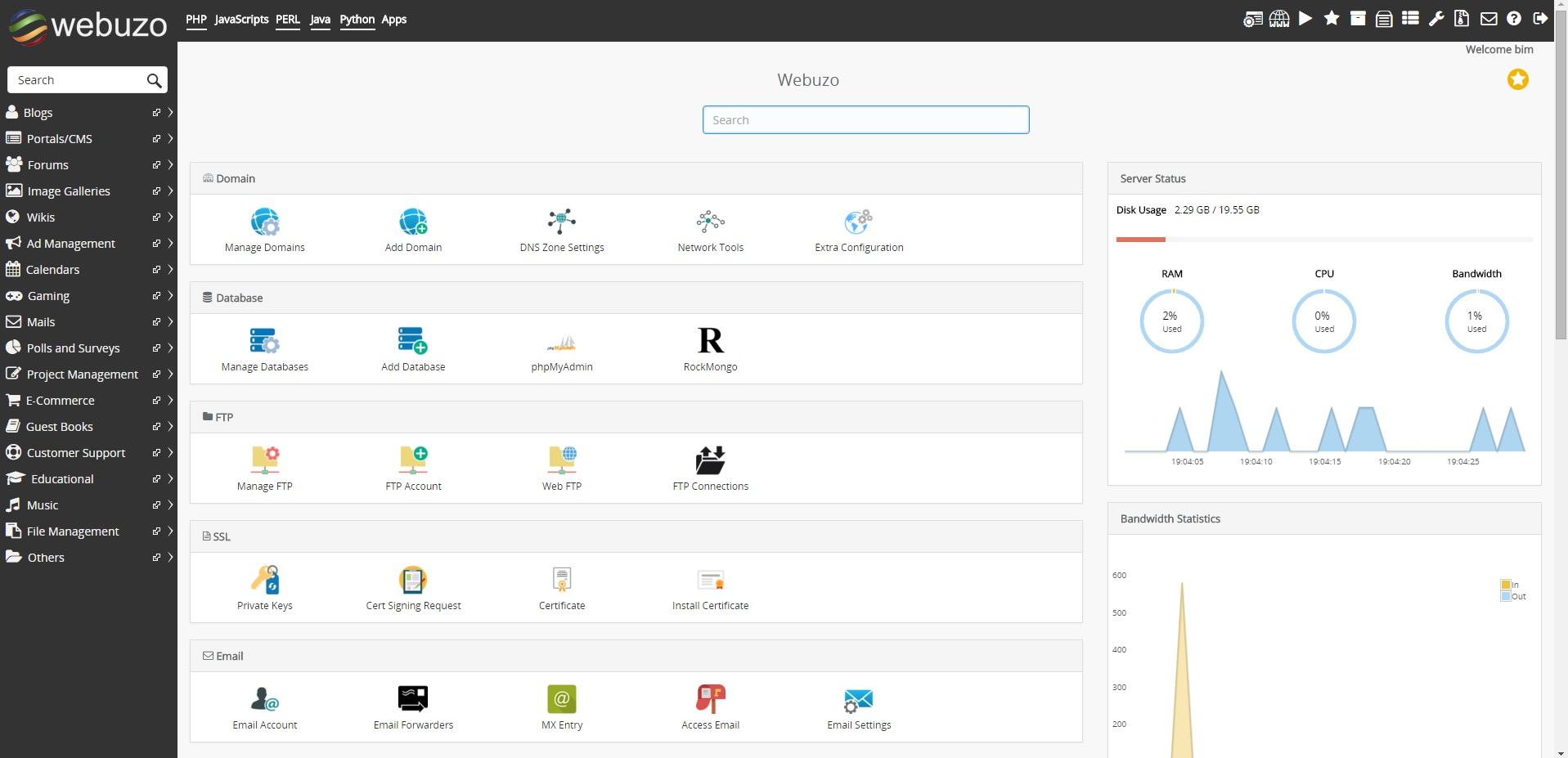 Webuzo là một trình quản trị VPS an toàn, bảo mật, hỗ trợ nhiều công cụ dựa trên máy chủ như Apache, MySQL, PHP, PERL, MongoDB, v.v. Nó cũng hỗ trợ RockMongo và phpMyAdmin cho các cấu hình cấp quản trị viên. Giao diện quản lý máy chủ đơn giản