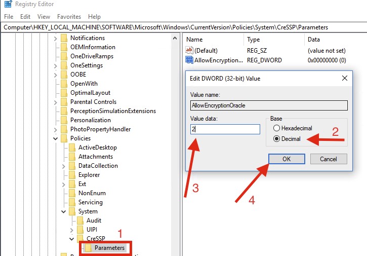 HKEY_LOCAL_MACHINE\SOFTWARE\Microsoft\Windows\CurrentVersion\Policies\System\CredSSP\Parameters